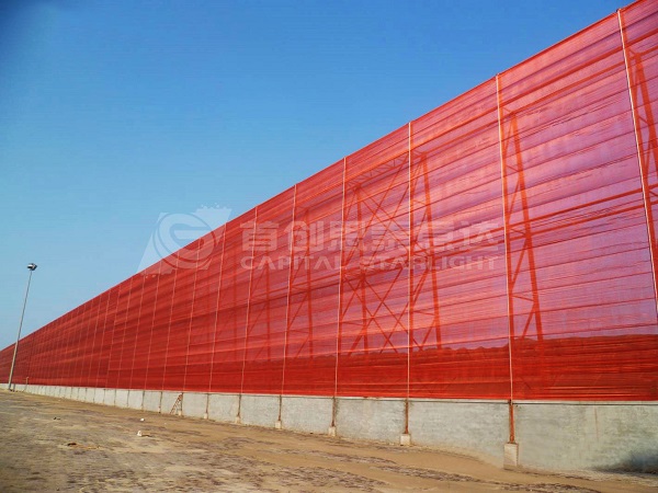 我公司生產(chǎn)的“態(tài)達(dá)”牌擋風(fēng)抑塵網(wǎng)采用高強(qiáng)度聚酯纖維長絲以特殊的結(jié)構(gòu)編織而成。具有抗日光、火、熱、霜凍、霉變、腐爛、酸、堿、鹽等特性,耐用性好,使用壽命長達(dá)20年;其設(shè)計(jì)的孔隙既能隨風(fēng)產(chǎn)生自凈功能,以避免粉塵積累,又能實(shí)現(xiàn)比實(shí)體墻更好的抑塵效果:經(jīng)風(fēng)洞試驗(yàn)表明最佳起塵抑制率可達(dá)90%左右;同時(shí)抑塵網(wǎng)鋼架架構(gòu)簡單、節(jié)約鋼材、從而造價(jià)更低。